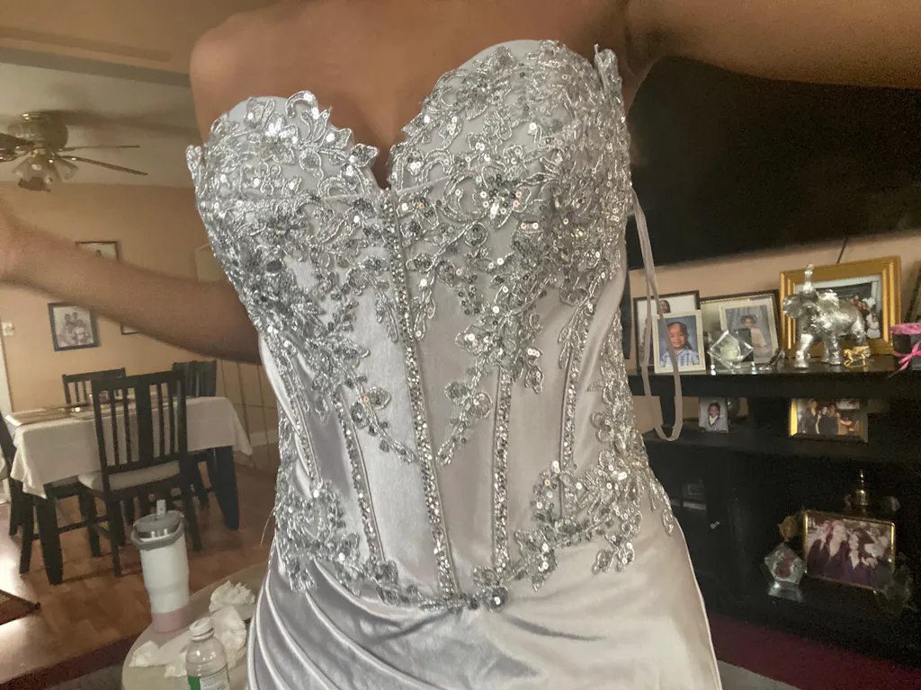 I'll put my measurements below, but this dress is actually perfect. The measurement chart is true to size, but the pictures of the dress don't do it justice. The fabric feels great on the skin. The dress is a bit heavy due to the train, but it's so worth it for the beautiful silhouette. I would 100% buy from prom girl again. Incase any sequins fall off, an extra bag of sequins is included. There is also a baggie including some excess fabric to string the corset together incase the first string breaks or gets damaged. This is so helpful to bring along when you go to color match ur nails, shoes, and accessories. Literally the perfect experience. I will say, order your dress in March because this one sold out in my size on March 29th in 2026. Good luck prom dress shopping girls 💕