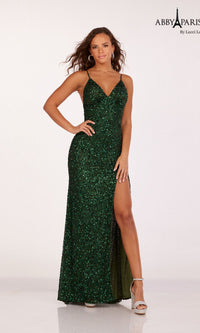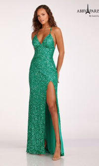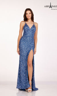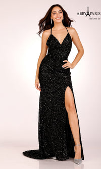 Sparkly and sultry, this backless sequin prom dress is dazzling for formal celebrations. Fully sequined from the low v-neckline to the end of the train, this fitted long prom dress hugs the curves with shimmering style. Adjustable spaghetti straps criss cross against the open back of this v-neck prom dress. A high side slit makes moving and dancing a breeze. Turn heads in this backless sequin prom dress with train.