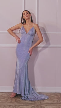 Steal the show in this long glitter prom dress 200 from Aerie Couture. With a figure-flattering empire waist, this sexy long glitter evening gown has a deep v-neckline and thin shoulder straps that lead to the strappy open back. In misses and some plus sizes, this long glitter formal dress has a stylish back drape that tops the hip-skimming long skirt as it flows into a small train that brings on the drama. Shimmer under the lights when you choose this long glitter prom dress that is as beautiful as it is radiant.