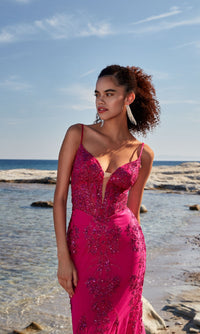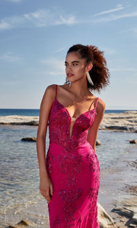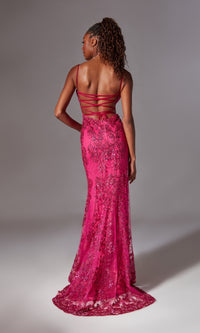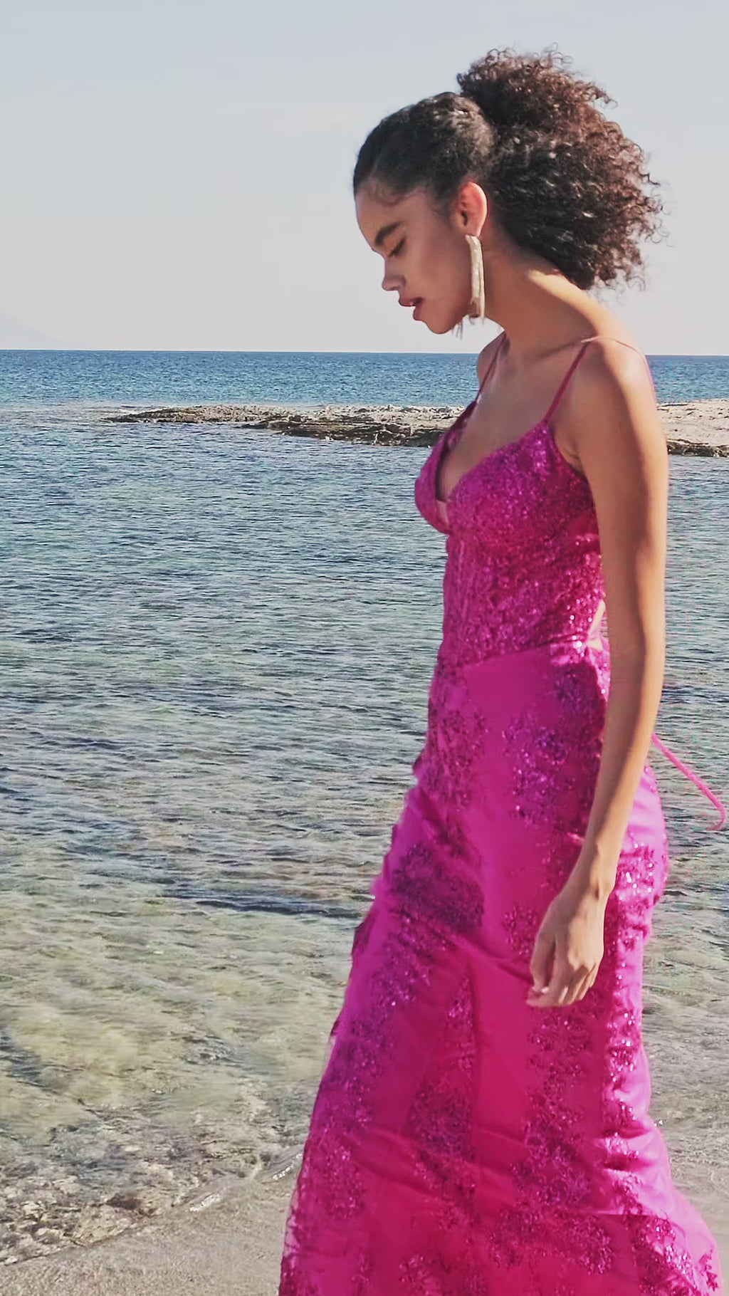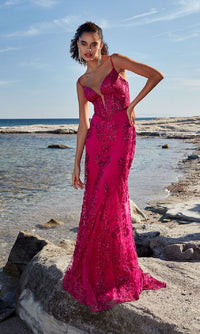 Own the spotlight in this strappy-back long prom dress 206 from Aerie Couture. With a gorgeous glitter print from the plunging v-neckline to the hem, this long evening gown is ready to stand out whether you are attending prom, a gala, or another black-tie event. Offered in misses and some plus sizes, this long glitter-print formal dress has a corset-style bodice with thin shoulder straps that lace up over the open back, while the hip-skimming long skirt has volumizing godets that create a small train that flows behind. Giving your look a spectacular elevated edge, this strappy-back long glitter-print prom dress is ready to be a real show stopper at your memorable event.