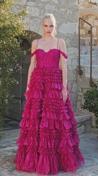 In bright raspberry pink, this long ruffled prom ball gown is undoubtedly the star of every show. With an off-the-shoulder sweetheart bodice, this ruffled long pink formal dress has banded sleeves that drape romantically over the upper arms, while thin bands lace up over the open back for the best fit. In misses and some plus sizes, this lace-up long pink evening gown has a spectacular long a-line skirt that flows to the floor in sparkly ruffled tiers. Simply spectacular for prom, galas, and other formal events, this raspberry pink long ruffled prom dress is sure to leave an indelible mark on hearts and memories.