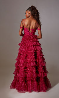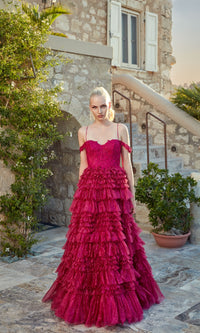 In bright raspberry pink, this long ruffled prom ball gown is undoubtedly the star of every show. With an off-the-shoulder sweetheart bodice, this ruffled long pink formal dress has banded sleeves that drape romantically over the upper arms, while thin bands lace up over the open back for the best fit. In misses and some plus sizes, this lace-up long pink evening gown has a spectacular long a-line skirt that flows to the floor in sparkly ruffled tiers. Simply spectacular for prom, galas, and other formal events, this raspberry pink long ruffled prom dress is sure to leave an indelible mark on hearts and memories.