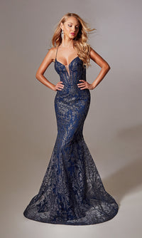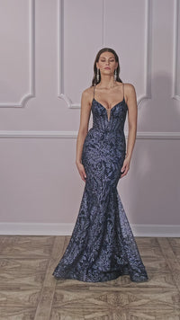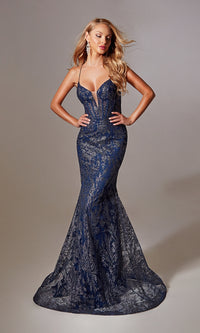 A gorgeous glitter print makes this long navy blue mermaid prom dress 239 an ultimate show stopper. Crafted in glittery dark blue fabric from the plunging v-neckline to the hem, this long blue formal dress is the perfect balance of sparkly elegance and figure-flattering style. In misses and some plus sizes, this navy blue long evening gown has thin shoulder straps that criss cross the open back for a fitted look at prom, galas, and other black-tie events. The long mermaid skirt opens in a side slit to complete the look of this long navy blue glitter prom dress that is effortlessly sexy with eye-catching allure.