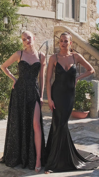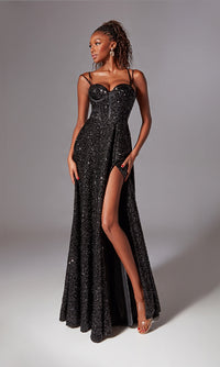 Step into a world of elegance in this long black glitter prom dress 273 from Aerie Couture. With a corset-style bodice that wraps around to the lace-up open back, this long black glitter evening gown gets a fitted look for prom, galas, and other black-tie events. In misses and some plus sizes, this long black glitter formal dress has a floor-length a-line skirt that opens in a sultry side slit before ending in an eye-catching train. A glamorous style that hints at seductiveness, this long black glitter prom dress is ready to shine like never before.