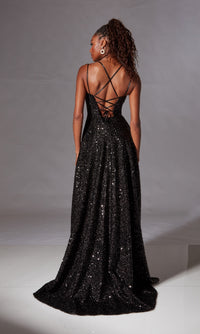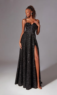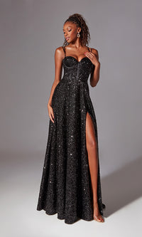 Step into a world of elegance in this long black glitter prom dress 273 from Aerie Couture. With a corset-style bodice that wraps around to the lace-up open back, this long black glitter evening gown gets a fitted look for prom, galas, and other black-tie events. In misses and some plus sizes, this long black glitter formal dress has a floor-length a-line skirt that opens in a sultry side slit before ending in an eye-catching train. A glamorous style that hints at seductiveness, this long black glitter prom dress is ready to shine like never before.