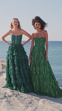 Nothing short of fabulous, this strapless long prom ball gown 276 is simply stunning. Crafted in glitter fabric from the plunging v-neckline to the hem, this a-line long ruffled evening gown gets a sexy vibe with the corset-style bodice that wraps around to the lace-up open back. Offered in misses and plus sizes, this long glitter formal dress has a gorgeous long a-line skirt that flows to the floor in fluffy ruffled tiers. Simply spectacular for prom, galas, and other formal events, this strapless long a-line glitter prom dress allows you to step into the night like the true star you are.