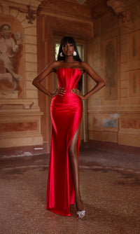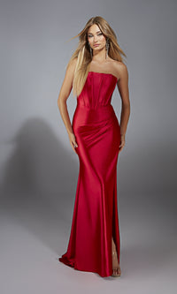 Strapless long simple prom dress under $200 with a corset bodice that laces up in back.