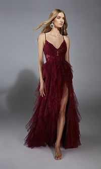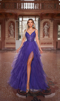 Ruffled glitter prom ball gown with a v-neck lace bodice, adjustable spaghetti straps, and a leg slit.