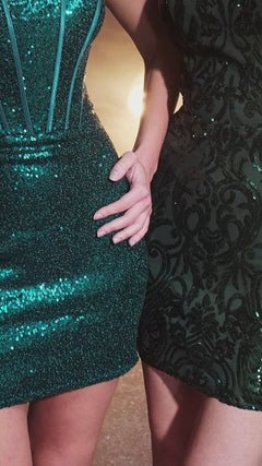 In misses and plus sizes, this strapless short green homecoming dress 819 is a mesmerizing choice for your big night. A stand-out style for homecoming, cocktail parties, and other semi-formal events, this strapless short green party dress has shimmering sequins from the scoop neckline to the hem. The short green cocktail dress has a corset-style waist that wraps around to the lace-up back, while the hip-skimming mini skirt ends well above the knees. Catch the spotlight without paying an arm and a leg in this strapless short green sequin homecoming dress that costs less than $150.