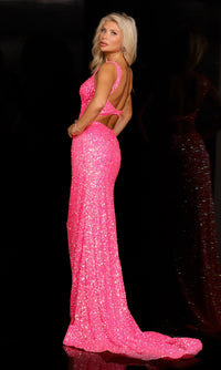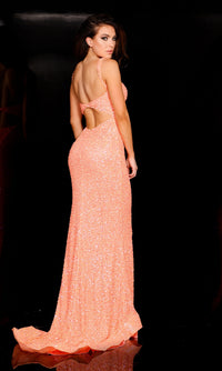 So elegant, this long sequin formal dress is as slinky as it is dazzling. The gorgeous floor-length evening gown is fully sequined from the square neckline to the floor for an eye-catching look at prom, military balls, and other fancy formal events. The long sequin gown has supportive shoulder straps that lead to the horizontal band that crosses over the open back before beautifully framing the cut-out detail. The open-back sequin evening dress smooths over the hips, flows to the structured horsehair hemline, and pools into a small train for a look of drama. Look and feel like a celebrity on the red carpet when you choose this upscale long sequin formal dress that is offered in misses and extended sizes.