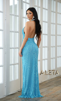 Here's a royal blue long sequin formal dress that looks as if it is dripping in fine jewels. The dark blue halter dress has beautiful sequin designs from the deep v-neck bodice to the floor for a dazzling look at prom, military balls, and other formal events. The long blue evening gown has a v-neck halter bodice with shoulder straps that attach at the back of the neck, while topping the open back for a sexy vibe. A wide banded waist offers a long and lean look to this elegant halter gown, while topping the curve-contouring long skirt that opens in a side slit before reaching the floor. Well suited for the girl who loves to sparkle, this royal blue long sequin formal dress is sure to get endless compliments on your very special evening.