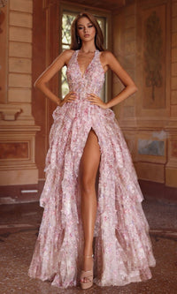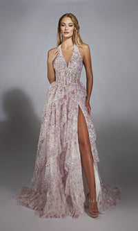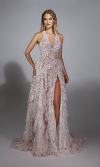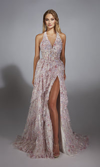 Light pink prom ball gown by Alyce Paris. This pastel prom dress features a halter v-neckline, an open back, a sheer corset bodice, layered a-line skirt with a slit, and allover sparkly floral embellishments.
