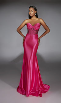 A stand-out look is yours in this strapless long corset prom dress 61851 by Alyce Paris. A stunning choice for prom, galas, and other formal events, this strapless sweetheart long evening gown features a rhinestone-beaded corset that wraps around to the sheer back. In misses and some plus sizes, this beautiful long formal dress has a gleaming mermaid skirt that hugs the hips before cascading into a small train. The crowd won't be able to resist the glitz and glamour when you choose to make your entrance in this strapless logn corset prom dress by Alyce Paris.