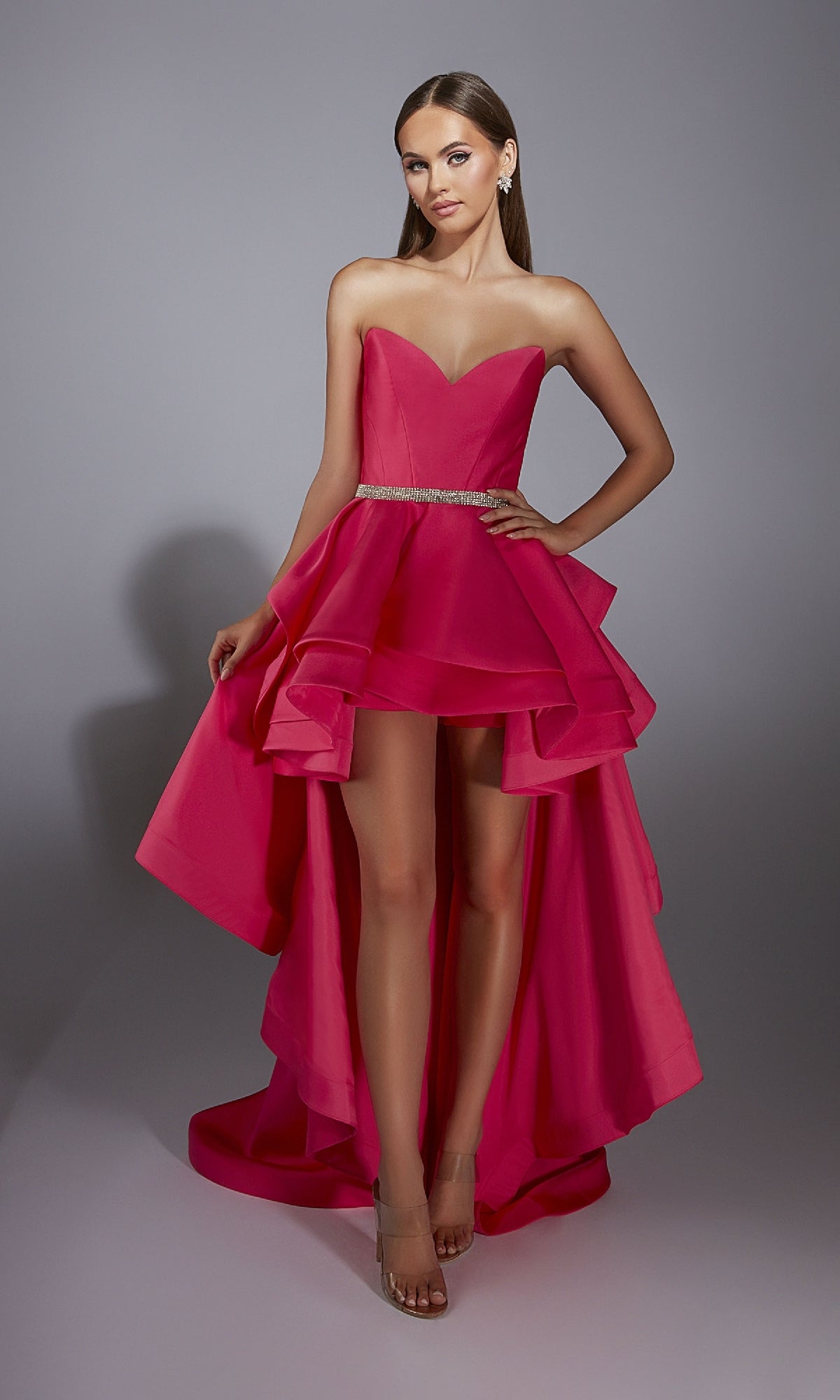 Strapless high-low mikado prom dress by Alyce Paris featuring a beaded waistline and a layered a-line skirt with shorts underneath.