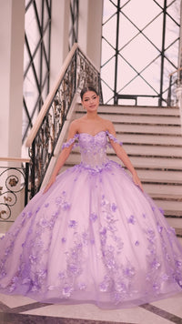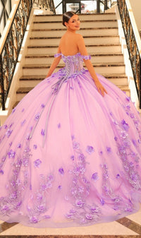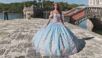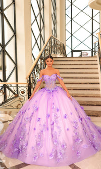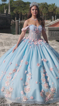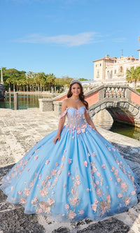 Long off the shoulder tulle a-line quinceanera ball gown with sweetheart neckline, sheer corset bodice and floral applique.