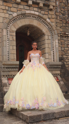 This exquisite quinceanera dress showcases a strapless sweetheart neckline, a fitted corset bodice, and intricate floral lace appliqués. Layers of tulle create a lavish ball gown skirt, with detachable sheer puff sleeves adding a romantic touch. The quinceanera ball gown features beautiful floral lace appliqués that adorn the bodice and continue onto the skirt's hem, creating a fairy tale-inspired look. A dramatic detachable bow detail at the back combined with a cathedral-length train gives this quinceanera dress a regal charm.