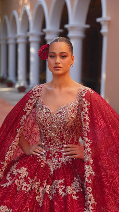 Here's a red and gold quincea¤era dress that's truly fit for a princess. Crafted with an exquisite floral glitter print, this quince ball gown is beautifully embellished with gold embroidered lace that's topped by bead and stone accents for extra shimmer. The lace-up back is both chic and comfortably adjustable. Detachable floor-length cape sleeves enhance the majestic glamor of this showstopping red and gold quince dress. Look like royalty on your milestone birthday when you wear this ball gown quincea¤era dress with cape sleeves.