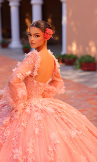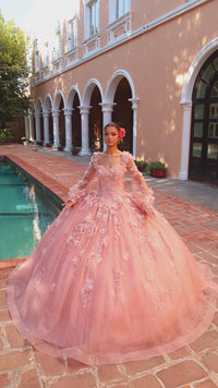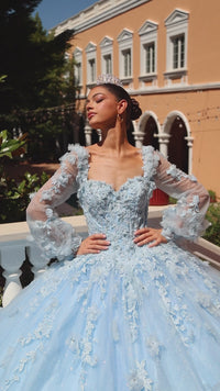 In this ball gown quinceanera dress, you'll be a vision of elegance at your sweet 15 party. With 3-D flowers and embroidered lace shimmering with bead and stone accents, this quince ball gown is beautifully sophisticated. The gentle shimmer of the poofy glitter tulle skirt adds to the charm of this corset quinceanera dress. Detachable sheer bishop sleeves provide a modest and delicate princess vibe. For a luxurious look on your birthday, wear this embroidered lace and glitter quince dress.