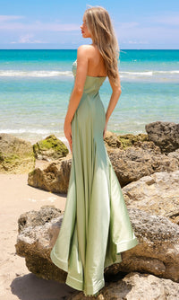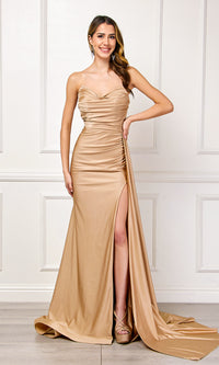 Here's a beautiful strapless long formal dress that is as classy as it is alluring. From Amelia Couture, this long designer dress hugs the curves from the cowl neckline to the floor, while side ruching creates a fitted look. The elegant evening gown includes an eye-catching side drape that flows behind the hip-hugging long skirt as it opens in a side slit before reaching the floor. So elegant for prom, military balls, and other formal events, this strapless long formal prom dress is surprisingly affordable, at under $200.