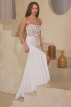 Shine bright in this strapless long prom dress 3042 from Amelia Couture. With a beaded sheer bodice, this strapless long formal dress is sure to sparkle under the lights at prom, galas, and other fancy dances. The strapless evening gown has thin bands that lace up over the open back for the best fit, while the hip-skimming long skirt opens in a side slit before ending in a dramatic train. Combining sparkly details and a flattering silhouette, this strapless long prom dress is one they won't be able to take their eyes off of.