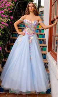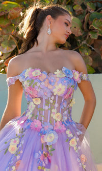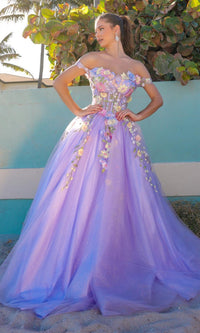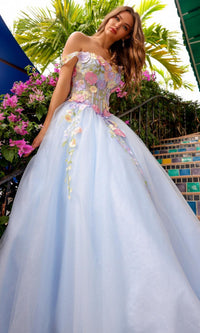 Get ready to feel like a fairy-tale princess in this long prom ball gown from Amelia Couture. With multi-colored 3-D flowers from the sweetheart neckline to the middle of the full and fabulous skirt, this off-the-shoulder long formal dress will leave an indelible mark on hearts and memories whether you are going to prom, a debutante ball, or another black-tie formal. The off-the-shoulder long a-line evening gown has banded sleeves that offer a sultry look as they romantically drape over the upper arms, while thin bands lace up over the open back for the best fit. The multi-layered long a-line tulle skirt completes the look of this fabulous long prom ball gown that is offered in misses and some plus sizes.
