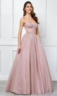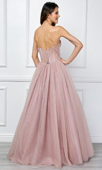 Strapless prom ball gown with a sweetheart neckline, a lace-up back, and a full tulle skirt.