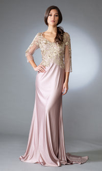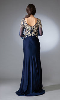 Here's a gorgeous long sleeve mother-of-the-bride dress by Amelia Couture for the second most important woman on the big day. In misses and some plus sizes, this elegant long evening gown features a beautifully embroidered bodice with sheer three-quarter long sleeves. The gorgeous long formal dress has a coordinating long skirt that slightly smooths over the hips before flowing down to a regal floor length that completes the look. Richly designed for the stylish mother of the bride, this long sleeve formal dress is also an excellent choice for galas, formals, and other black-tie events. Surprisingly under $200, this long sleeve long mother-of-the-bride dress is sure to make you look like a million bucks without charging up the credit cards.
