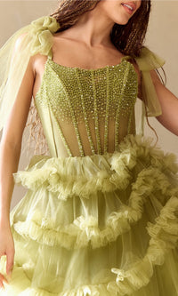 Be bold in this spectacular long ruffled prom dress by Amelia Couture. With an embellished sheer corset that wraps around to the lace-up back, this fabulous long a-line formal dress gets a feminine look with wide shoulder straps that tie into bows. The eye-catching long evening gown has a fully-lined long skirt with a sheer overlay that flows to the floor in ruffled tiers. A lavish choice for prom, galas, and other formal events, this long ruffled prom dress is more than just a dress, it's a story waiting to be told.