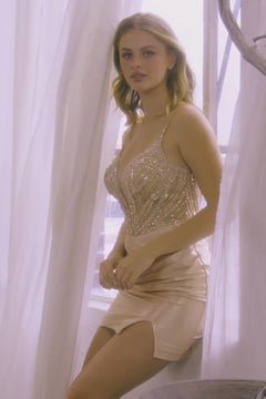 Slip into this lace-up short homecoming dress 9061S by Amelia Couture and know you look good. With a sheer beaded corset-style bodice, this short party dress laces up in the back for the best fit at homecoming, weddings, and other semi-formal events. The curve-hugging short cocktail dress has a mini skirt with tummy-camouflaging ruching, booty-contouring back pleats, and a small side slit that completes the design. As sparkly as it is sexy, this lace-up short homecoming dress is also affordably priced under $150.