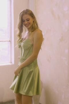 A woman smiles at the camera in front of beige curtains, wearing the Amelia Couture 9071S Lace-Up Strapless Hoco Dress—a light green satin semi-formal dress with a fitted bodice and flared skirt.