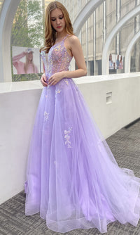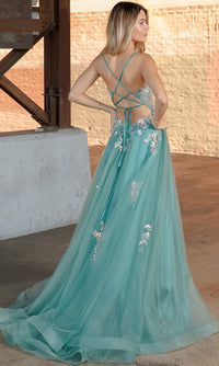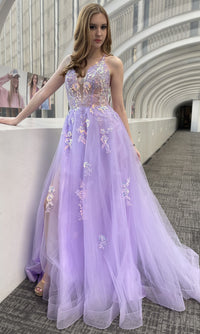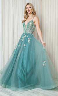 With beautiful floral embellishments, this long pastel prom ball gown is sure to kick up the wow factor. An old Hollywood style for prom, military balls, and other formal events, this plunging v-neck evening gown is a beautiful choice that is sure to stand out in a crowd. With a sheer corset-style bodice, this long a-line formal dress has thin shoulder straps that adjust over the open back, while the fully-lined long skirt has a floral-embroidered sheer overlay that opens in a side slit before reaching the floor. Simply gorgeous, this long pastel prom ball gown by Amelia Couture is surprisingly under $300.