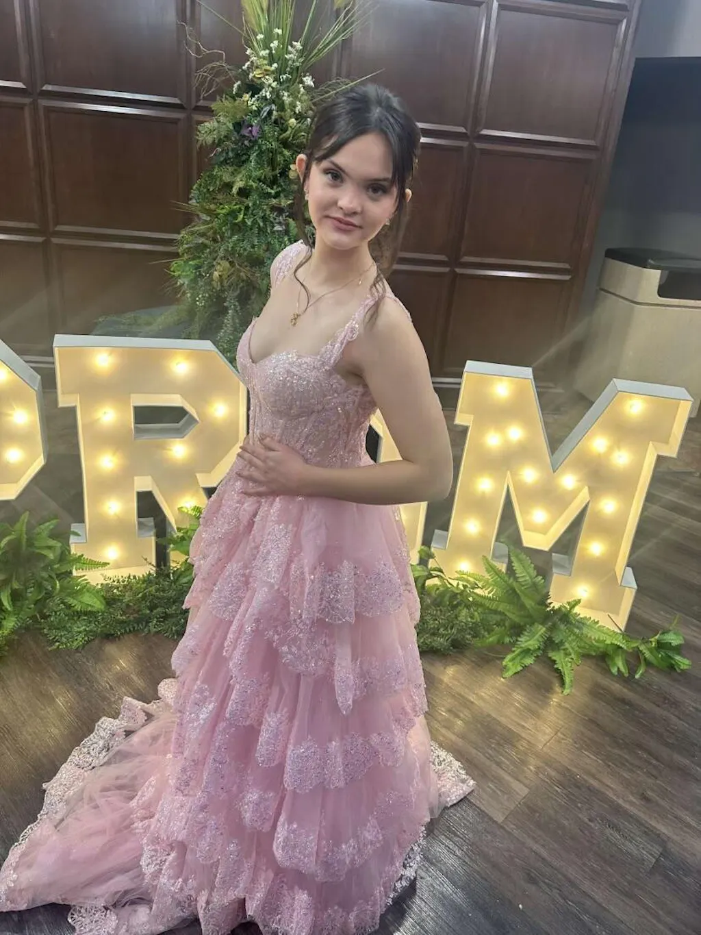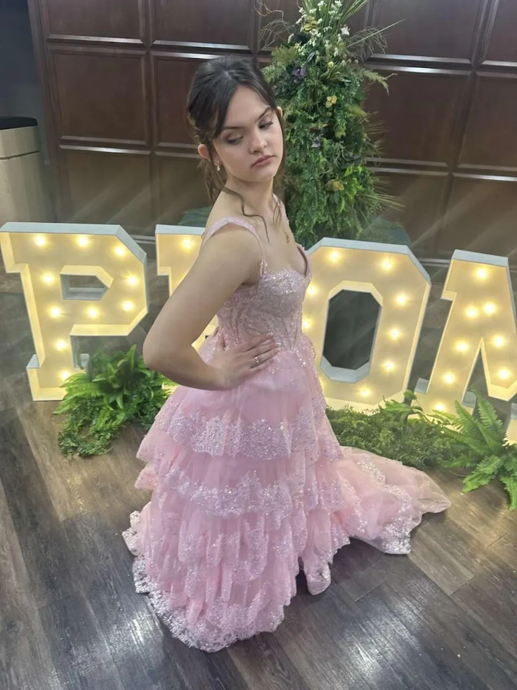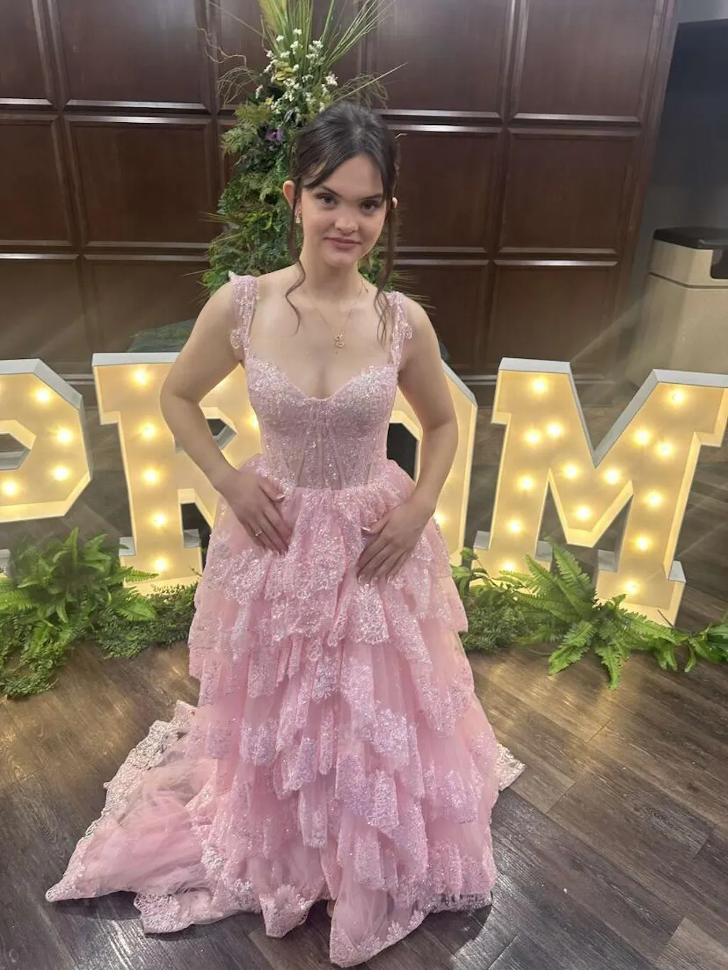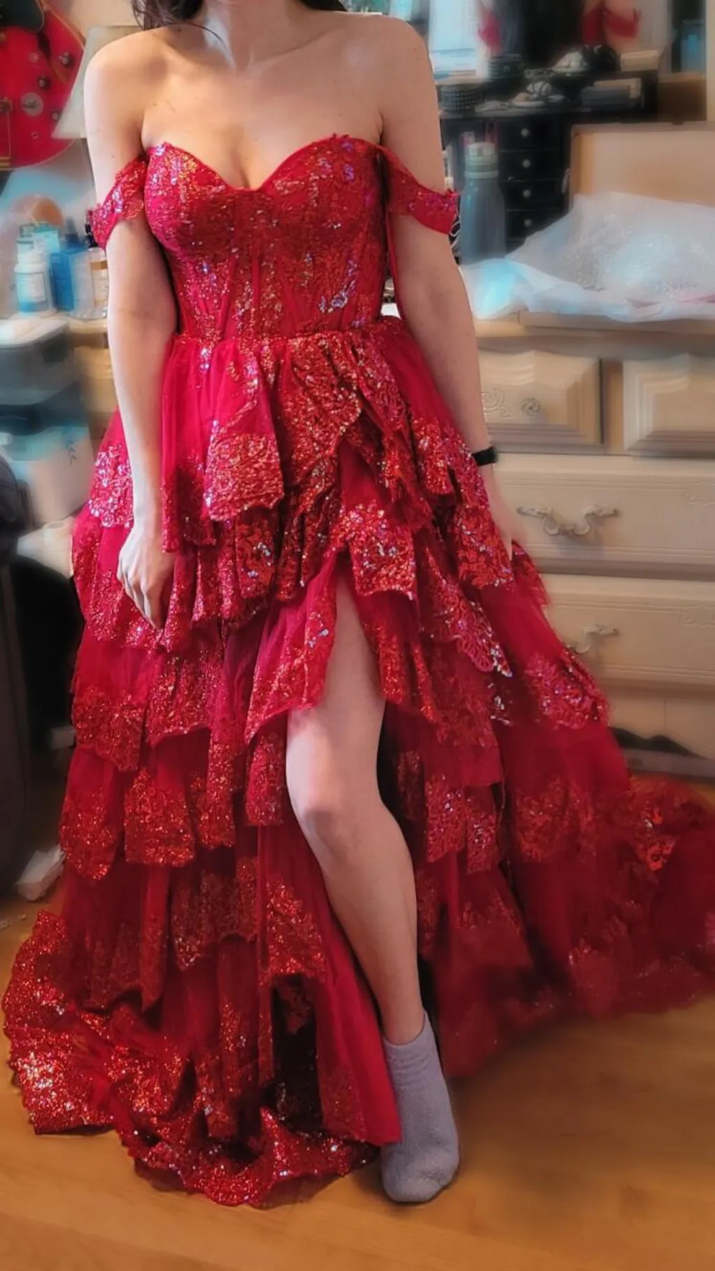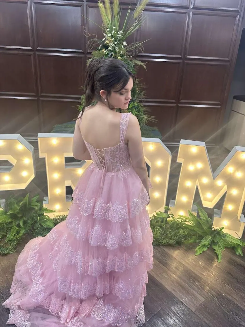 | Details: | Ball Gown, Layered Ruffled Skirt, Sheer Corset Bodice, Skirt Slit, Glitter |