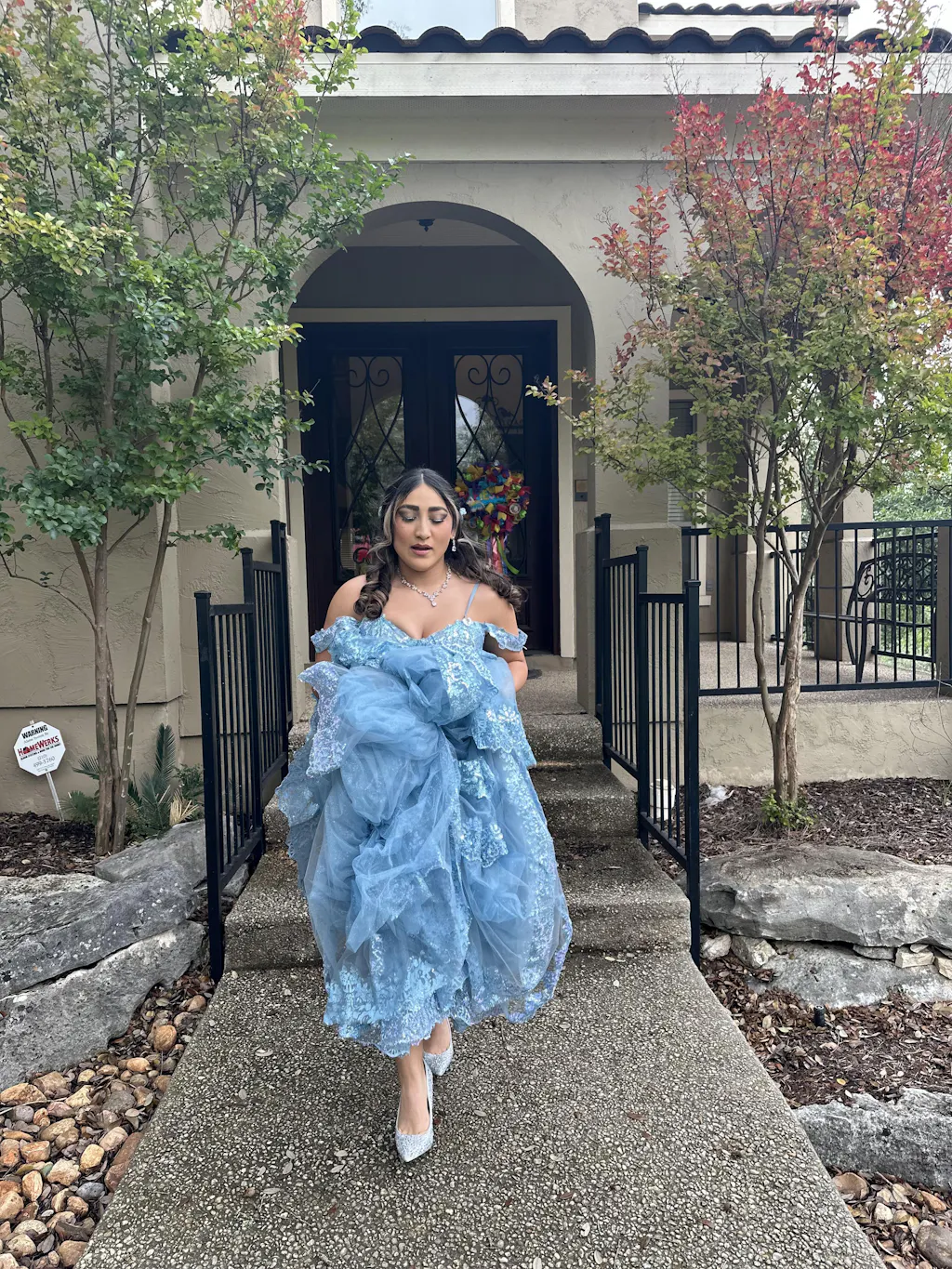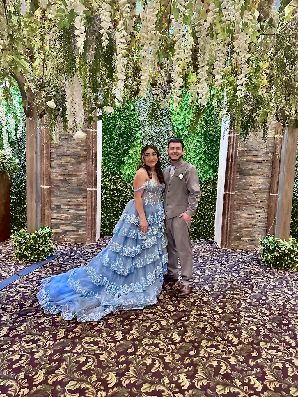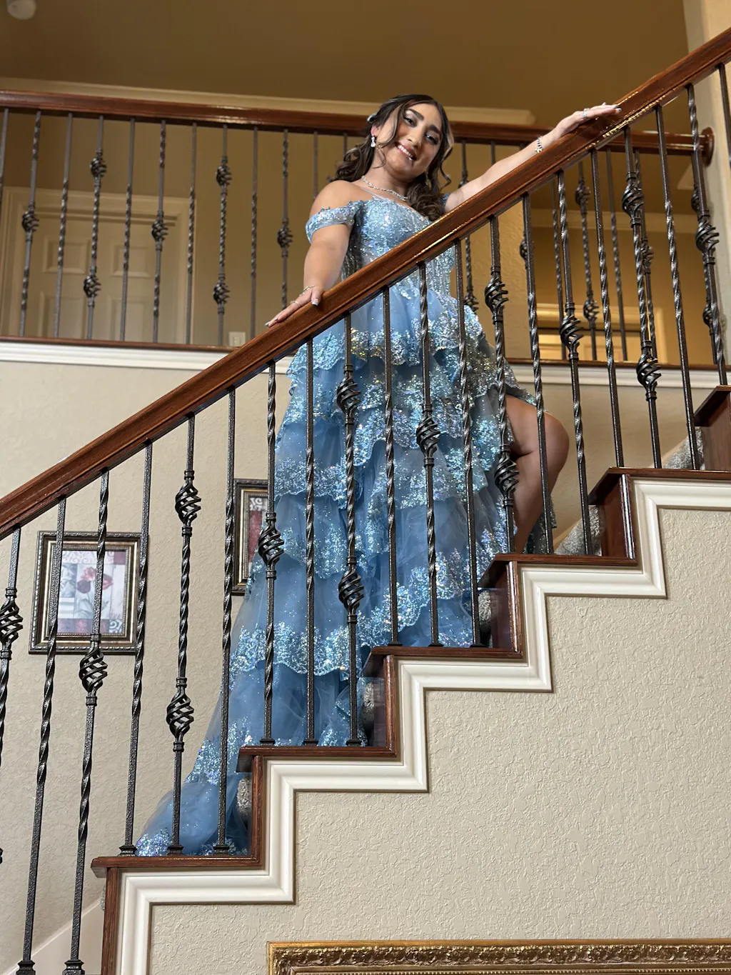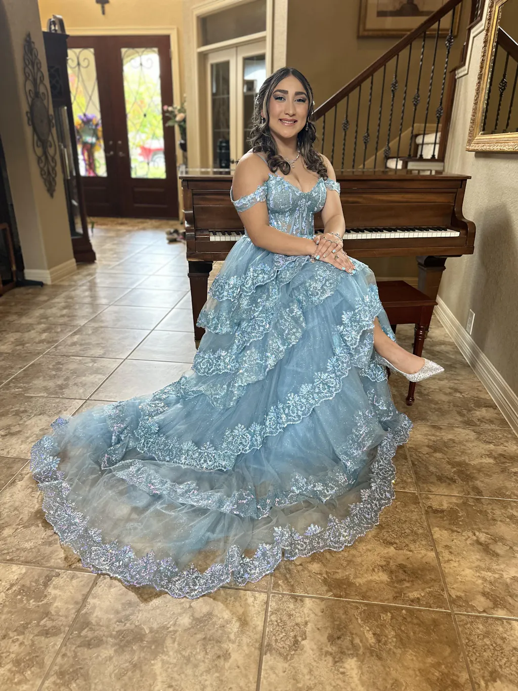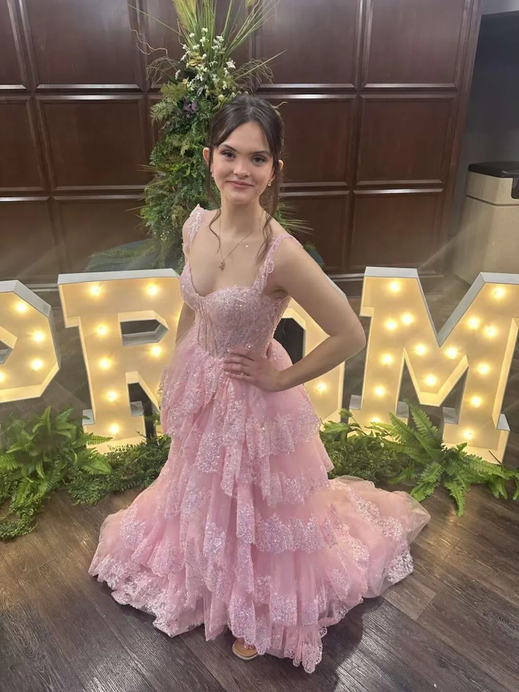 | Details: | Ball Gown, Layered Ruffled Skirt, Sheer Corset Bodice, Skirt Slit, Glitter |