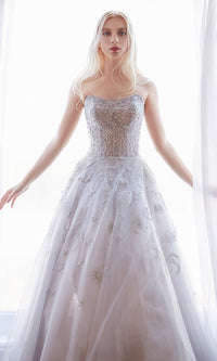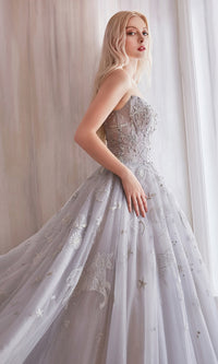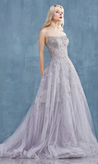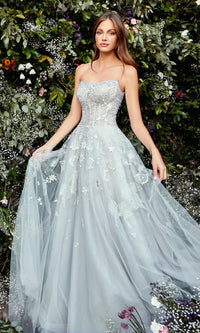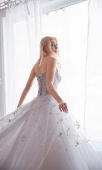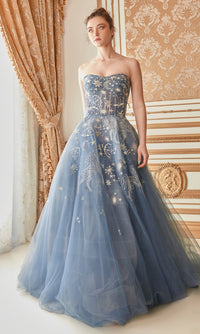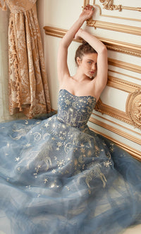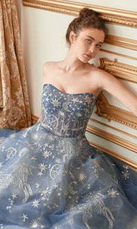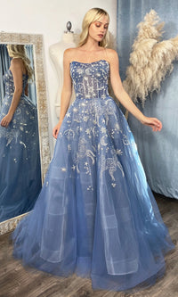 Star gazers are sure to love this strapless long prom gown with contrasting constellation prints. Imagine making your entrance to prom, military balls, and other formal events in this strapless evening gown with groups of stars that collectively form beautiful patterns or pictures just like the constellations in the midnight sky. The eye-catching long a-line formal dress has a fully-lined long skirt with a sheer star-studded overlay that flows to the floor in a flattering shape. A great find for the girl who loves sky watching, this strapless prom ball gown is ready to impress the crowd on your big night.