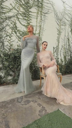 Pearl-Embellished Long Sleeve Formal Dress A0997