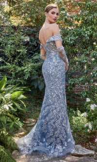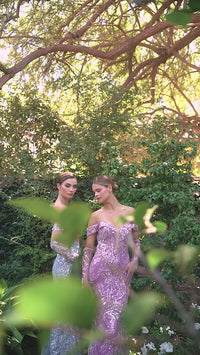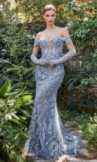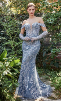Glamorous style is back with this off-the-shoulder long glitter formal dress with matching gloves. The deep v-neck evening gown features swirling sequin and glitter designs from the off-the-shoulder neckline to the floor for a sparkly look at prom, galas, and other formal events. Off-the-shoulder banded sleeves drape over the upper arms, while the fully-lined long skirt has a shimmering sheer beaded-tulle overlay that skims the hips before ending at the floor. Lustrous matching gloves adds the final touch to this off-the-shoulder long glitter formal dress that is excellent for the girl who loves a dramatic look.