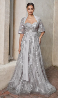 Simply stunning, this strapless long prom ball gown shimmers under the lights. With sparkly leaf beadwork from the sweetheart neckline to the hem, this long strapless formal dress is sure to shine at prom, military balls, and other black-tie events. To keep the chill away, a matching caplet is essential to this long sweetheart evening gown and is completely removable if a sleeker style is warranted. Offered in misses and plus sizes, this long beaded formal dress has a fully-lined long skirt with a beaded sheer overlay that flows to the floor in a flattering a-line shape that completes the look. Step into style and shine in the spotlight when you choose this strapless long beaded prom ball gown with removable capelet.