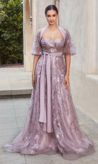 Simply stunning, this strapless long prom ball gown shimmers under the lights. With sparkly leaf beadwork from the sweetheart neckline to the hem, this long strapless formal dress is sure to shine at prom, military balls, and other black-tie events. To keep the chill away, a matching caplet is essential to this long sweetheart evening gown and is completely removable if a sleeker style is warranted. Offered in misses and plus sizes, this long beaded formal dress has a fully-lined long skirt with a beaded sheer overlay that flows to the floor in a flattering a-line shape that completes the look. Step into style and shine in the spotlight when you choose this strapless long beaded prom ball gown with removable capelet.