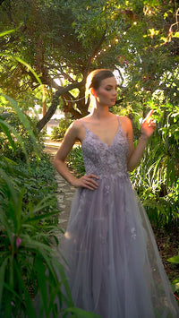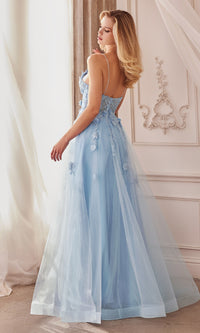 Beautifully feminine, this floral-embroidered long a-line prom gown is a classic style with stylish upgrades. The pretty v-neck evening gown has fitted bodice with 3-D flowers and sheer embroidered mesh that wraps around to the strappy open back. The delicate floral designs flow down to the hips of this long formal dress, while the fully-lined long tulle skirt flows to the floor in an a-line shape. In misses and some plus sizes, this floral-embroidered long a-line prom gown is an angelic choice for prom, military balls, and other formal events.