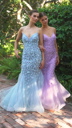 Two women stand outdoors in long formal dresses with thin straps and 3D floral appliques; one wears a light blue gown, the other the Floral Beaded Long Mermaid Prom Dress A1201 in lavender.