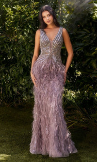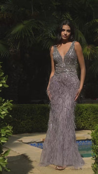 In soft English violet purple, this sleeveless long feather prom dress A1273 is sure to create a stir. The plunging v-neck long purple formal dress has rows and rows of shimmering sequins in a starburst design on the sleeveless bodice. The long purple evening gown has a fitted long skirt with matching sequins at the waist and free-flowing feathers from the hips to the floor. A fabulous choice for prom, galas, and other black-tie formal events, this sleeveless long feather prom dress combines gorgeous style and eye-catching details for a mesmerizing look that is sure to turn heads.