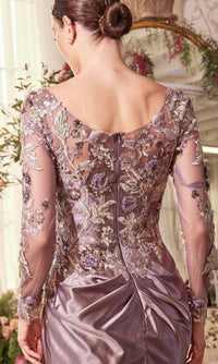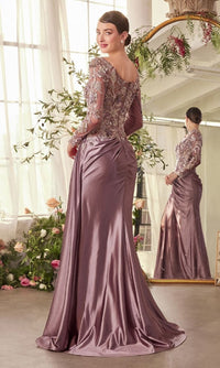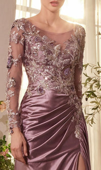Elegant long fitted formal dress by Andrea and Leo featuring a floral lace-embroidered bodice with scattered floral appliques, an illusion high scoop neckline, sheer long sleeves, and a midrise scoop back with a zipper closure. The dress transitions into a ruched satin skirt with gathering at the waist for a flattering silhouette, a thigh-high slit, and a mini train.