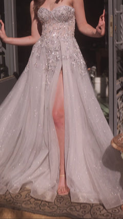Simply captivating, this beaded strapless sweetheart long prom dress A1415 is fairy-tale worthy. With beaded embroidery from the sweetheart neckline to the hips, this strapless long evening gown gets a flirty look with a sheer corset that wraps around to the back. The strapless long formal dress has a fully-lined long poofy skirt with a sheer beaded overlay that opens in a side slit before draping to the floor in an a-line shape. Step into a world of sparkly fantasies for prom, galas, and other formal events when you slip into this beaded strapless long prom dress by Andrea and Leo.