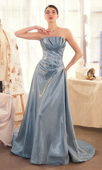 Strapless long blue prom dress crafted from luxurious liquid satin and featuring a pleated structured bodice and a flowy a-line skirt.