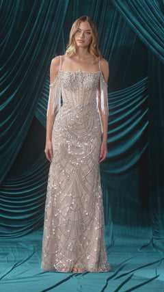 Fringed Long Beaded Prom Dress: Andrea & Leo A1510