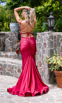 Made in the U.S.A., this faux-wrap long prom dress shows of the curves like no other. With a surplice v-neckline, this long designer dress by Atria Couture has doubled shoulder straps that cross over the open back before tying into a fully-adjustable bow. Ruching at the midriff creates a fitted look on this faux-wrap evening gown, while the long skirt has back ruching that offers a curvy look. A back godet flows into a small train that completes the look of this gorgeous faux-wrap long prom dress that is sure to turn heads at prom, a gala, or another formal event.