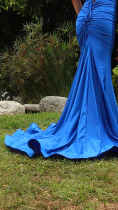 A woman in the Lace-Up Back Long V-Neck Prom Dress 6840H, a vibrant blue gown with a deep v-neck and crisscross lace-up back, stands outdoors before white classical statues and lush greenery.