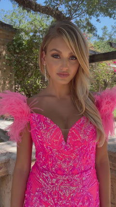 Brighten any room in this gorgeous short sequin cocktail dress with feathers. An impressive style for the girl who loves a bold design, this short sequin mini dress has feathered off-the-shoulder bands that flow to the corset back as it laces up for the perfect fit. A swirling sequin pattern flows from the sweetheart neckline to the notched hem of this short party dress for a dazzling look at homecoming, sweet-16 parties, and other semi-formal events. Offered in misses and plus sizes, this short sequin cocktail dress with feathers is a sensation choice for the girl who loves to shine.