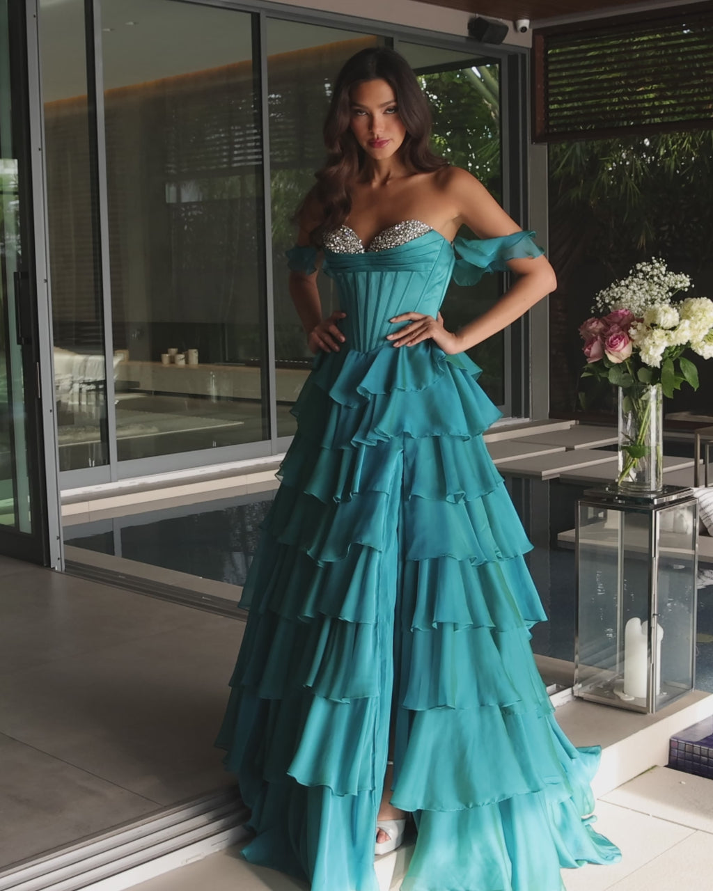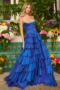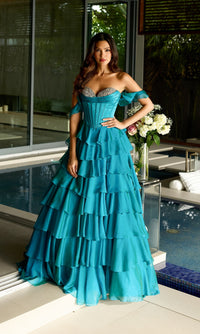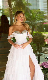 If you're looking for an off-the-shoulder long ruffled prom dress 42213 with different looks, this is the one. From Ava Presley, this gorgeous long a-line evening gown has a stylish corset-style bodice with banded sleeves that are completely removable for a sleeker strapless look at prom, galas, and other formal events. The off-the-shoulder long formal dress has a beaded peek-a-boo sweetheart neckline and a fabulous long a-line skirt that flows to the floor in ruffled tiers to complete the look. If you love feminine dresses with a sweet Southern style, check out this off-the-shoulder long ruffled prom dress that is sure to turn heads when you reach the red carpet.