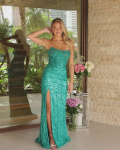 A woman in the Strapless Sequin Prom Gown, Ava Presley 47156, featuring a corset bodice and thigh-high slit, stands indoors by large windows and elegant flower arrangements.